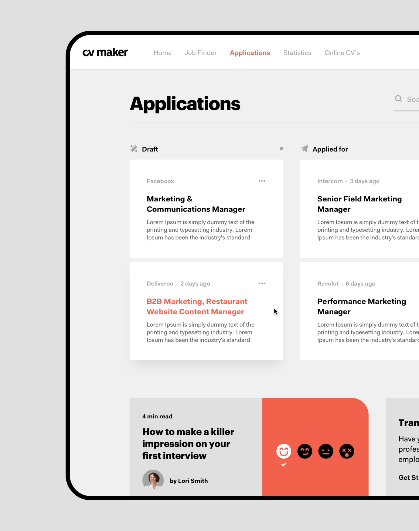 The product was rebuilt from the ground up to reduce friction and support users with different levels of experience. Core interactions were restructured around clearer flows and more intuitive editing, with features such as interactive previews, drag-and-drop functionality, and guided writing support helping users make stronger decisions with less effort. The system was extended to include job discovery, application tracking, and personal microsites, while the pricing model introduced a free tier to reduce abandonment at the paywall.