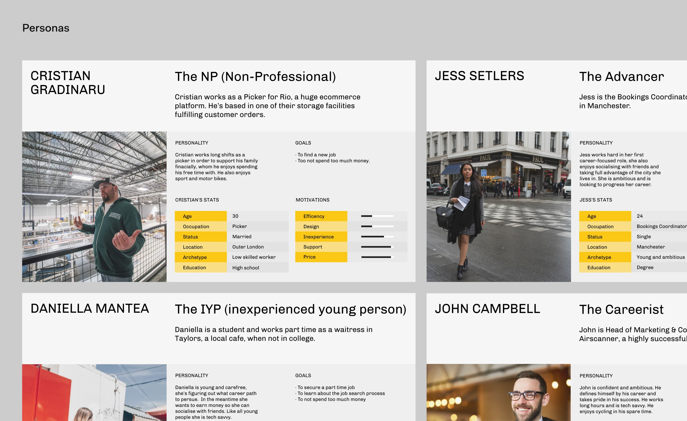 Quantitative and qualitative research ran in parallel, analysing customer CV data alongside user interviews to define four distinct personas. Usability reporting mapped retention and referral data, user flows, heatmaps, and abandonment points across the product. These insights shaped every subsequent decision, from brand direction and product features to pricing model and UX architecture.